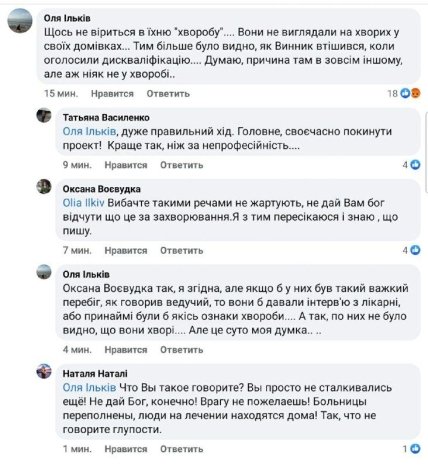 Але деякі глядачі, які є шанувальниками головного танцювального шоу країни, не повірили в хворобу Винника та Шоптенко. У коментарях користувачі написали, що учасники зовсім не виглядали хворими. Одні думають, що якби у пари дійсно був важкий випадок з COVID, то вони б вже давно лежали в лікарні, інші - що Винника спеціально "проплатили" на кілька ефірів, тому що у нього і так "гастролі на рік розписані", треті і зовсім порахували, що краще так покинуть проект, ніж через непрофесіоналізм.