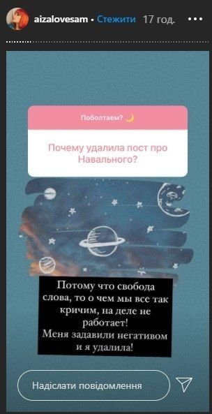 Пізніше в сторіз Долматова відповіла, чому видалила пост про Навального.