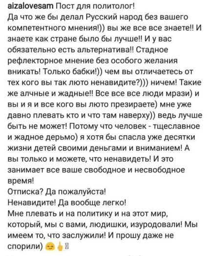 Цікаво, що пізніше Айза Долматова виклала ще один пост "для політологів", який пізніше також був видалений.