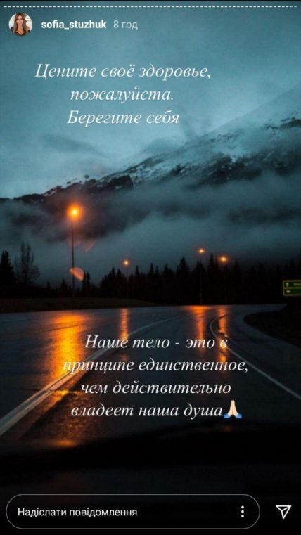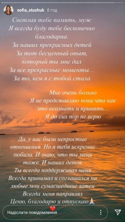 "Світла тобі пам'ять, чоловік. Я завжди буду тобі дуже вдячна. За наших дітей, за той безцінний досвід, який ти мені дав. За всі прекрасні моменти, за те, ким я з тобою стала. Мені дуже боляче, я не уявляю поки що як це усвідомити. Я до сих пір не вірю ", - написала Софія Стужук в Instagram stories.