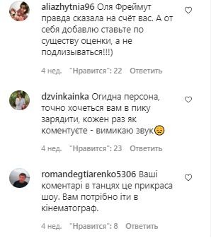 Згадаймо, що більш запам'ятовуються на проекті "Танці з зірками" стали перепалки балерини з учасницею шоу, української телеведучою Ольгою Фреймут. В одному з ефірів суддя описала танець для тіла Ольги як "довічне ув'язнення", а її ноги "не слухаються команди мозку". У наступному випуску телеведуча подарувала Катерині ножиці, щоб та "відрізала собі мову".