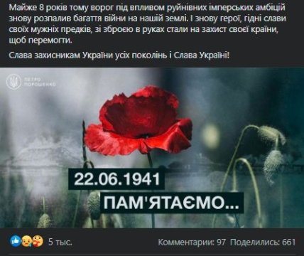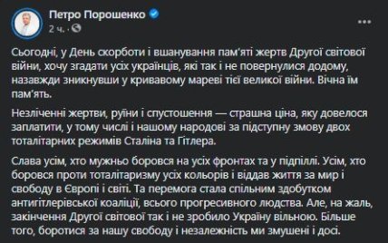 Петро Порошенко закликав у Facebook також вшанувати пам'ять українців, які загинули під час Другої світової війни.