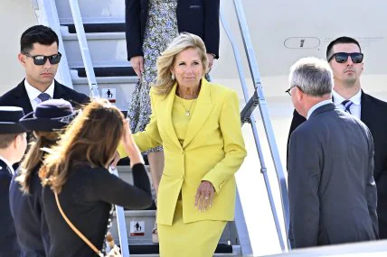 Виходячи з літака, Джилл Байден одразу викликала фурор. На ній був яскравий жовтий костюм, і діловий образ був доповнений срібною підвіскою у формі серця та сережками, схожими на зірочки. Туфлі перша леді вибрала із гострим носом нюдового відтінку.