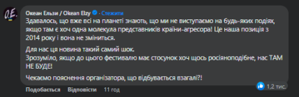 "Здавалось, що вже всі на планеті знають, що ми не виступаємо на будь-яких подіях, якщо там є хоч одна молекула представників країни-агресора! Це наша позиція з 2014 року і вона не зміниться. Для нас ця новина такий самий шок. Зрозуміло, якщо до цього фестивалю має стосунок хоч щось росіяноподібне, нас ТАМ НЕ БУДЕ!".