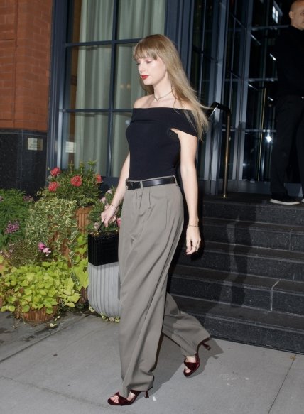 Тейлор Свіфт мала дуже шикарний вигляд в облягаючому чорному топі з відкритими плечима. Верх був заправлений у світло-коричневі штани, які відома виконавиця застебнула на талії чорним шкіряним ременем.