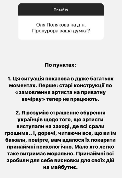 Вона зазначила, що старі конструкції "на замовлення артиста на приватну вечірку" під час війни вже не працюють. Не називаючи ім'я Полякової, Єфросиніна заявила що українці, яким набридлі подібні історії "життя на широку ногу" в той час, як інші співвітчизники гинуть від рук окупантів, вже "набажали" артистам такого, що покарали тих принаймні психологічно.