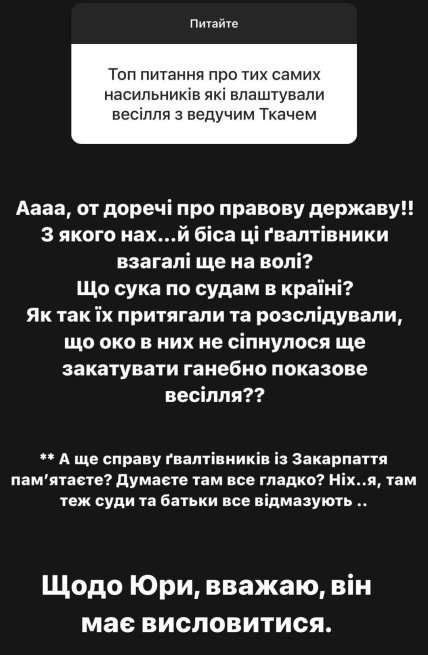 "З якого нах** біса ці гвалтівники взагалі ще на волі? Що с*ка по судам в країні? Як так їх притягли та розслідували, що око в них не сіпнулось ще закатувати ганебно показові весілля? А ще справу гвалтівників із Закарпаття пам'ятаєте? Думаєте там все гладко? Ніх**, там теж суди і батьки все відмазують", — зазначила Єфросиніна.