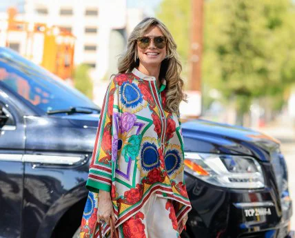 Знаменита німецька топ-модель та телеведуча Гайді Клум знову демонструє підтягнуту фігуру у розкішному вбранні. Тільки недавно на вулицях Лос-Анджелеса зірку застали в стильному, червоному костюмі зі шкіри, а зараз Гайді показалась в надзвичайно яскравій сукні, коли вона прямувала на зйомку чергового випуску America’s Got Talent: Fantasy League. Там зірка є зірковим членом журі.