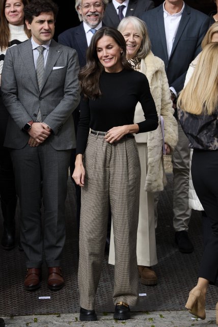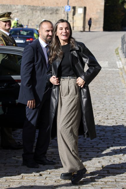Лук королеви-консорт склали: шкіряне пальто довжиною до колін з коміром, чорний светр і коричневі штани в клітку. Шикарне вбрання Летиція завершила тонким ременем і парою масивних чорних шкіряних лоферів із золотою пряжкою.