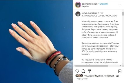 "Ми не будемо однією родиною. Я не візьму прізвище Гринкевич. Я не буду з людиною, яка зрадила мою країну. Я вірила. Зараз мені гидко, почуваюся обдуреною і використаною. Я виберу бути чесною перед собою. І залишуся Сонею Морозюк", — заявила художниця у своєму посту у соцмережі.