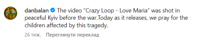 Зазначимо, за п’ять днів після російського вторгнення Дан Балан зробив у Instagram публікацію з прапором України, додавши в опис цитату з поеми національного героя та символу України, поета Тараса Шевченка. "Схаменіться! Будьте люди, бо лихо вам буде. Розкуються незабаром заковані люде, настане суд, заговорять і Дніпро, і гори! Боже, врятуй Україну! Всім серцем з вами!" — написав він українською 27 лютого 2022 року.
