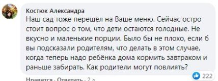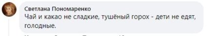 "Такая ерунда везде… Харьков тому пример, смотришь каждое утро на меню своего ребенка в саду… плакать хочется. То ли повара воруют, то ли продукты выделяют "самые хорошие", то ли спасибо нашему правительству и реформам…Но суть одна — бедные дети", — говорится в комментарии.