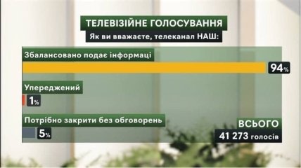 Во время прямого эфира на ТВ, проголосовало 41 тысяча 273 зрителя. 94% за ответ: — "Сбалансировано подает информацию", как "пристрастный" оценил 1%, и "нужно закрыть без обсуждений" 5% проголосовавших.