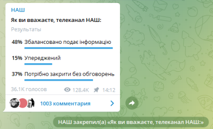 Telegram-канал. Голосование на данной платформе отличалось от выше описанных, тем, что пользователи увидели данный опрос, благодаря большому количеству репостов публикации. Всего пост увидело 128 тысяч 400 человек, а проголосовало 36 169. Результаты таковы: за баланс — 48%, за лишение лицензии — 37%, за пристрастность — 15%.