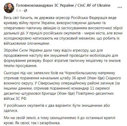 Кроме того, главком добавил, что во время боев на Чернобыльском направлении получил ранение начальник штаба 36 армии Восточного военного округа (город Улан-Удэ, неподалеку от границы Монголии). Также в Сиверском операционном районе был ликвидирован или получил ранение командир 11 десантно-штурмовой бригады (Улан-Удэ) ВДВ рф.