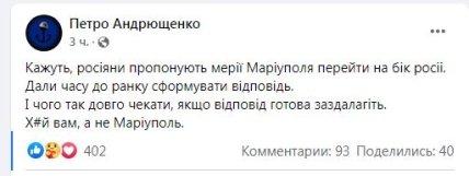 На требование о сдаче также отреагировал советник мэра Мариуполя Петр Андрющенко, который тоже заявил, что город в руки россиян передавать никто не собирается.
