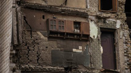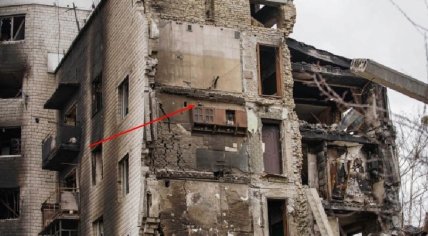Она побывала в Бородянке (Киевская область) и запечатлела на фото частично обрушившуюся во время обстрелов многоэтажку. Примечательно, что каким-то чудом на одной из стен уцелел и остался висеть кухонный шкаф вместе с фигуркой петушка на нем.