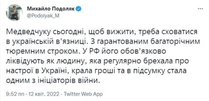 "Медведчуку сегодня, чтобы выжить, нужно спрятаться в украинской тюрьме. С гарантированным многолетним тюремным сроком", — написал он.