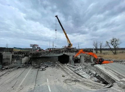 Житомирскую трассу убрали и расчистили, одновременно демонтировав разрушенный мост. Там же соорудили временную переправу через реку Ирпень из железных балок, а также построили земляную насыпь, отмечал министр.