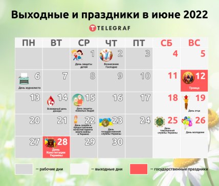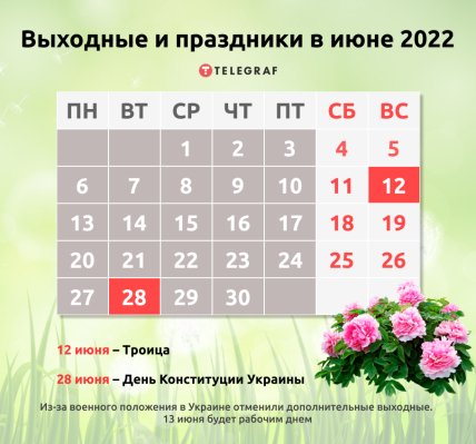 В июне 2022 года украинцы отмечают большие православные праздники Троицу, или Зеленые Святки, и Вознесение Господне, а в конце первого летнего месяца одно из самых главных событий в стране — День Конституции Украины. Так как праздник является государственными, то предусматривается дополнительный выходной, но в этом году все изменилось из-за войны.
