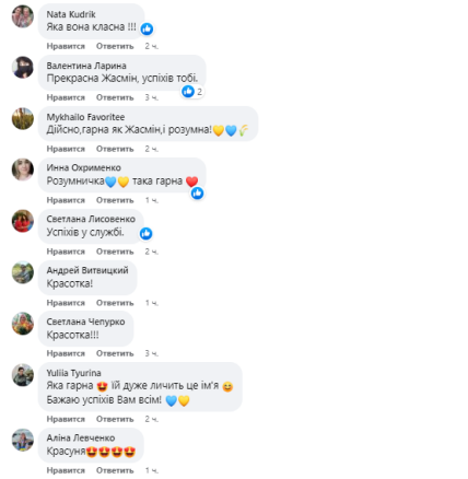 "Какая она классная!", "Прекрасная Жасмин, успехов тебе", "Красотка", "Ей очень идет это имя", "Умничка, такая хорошенькая", "Слава нашим четырехлапым друзьям", "Какое милое и красивое создание", "Коллега знаменитого сапера Патрона", — среди прочего, пишут в комментариях.