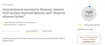 Шуточная петиция о том, чтобы предложить французскому лидеру отдать часть территории его страны путину, была обнародована на сайте Офиса президента.