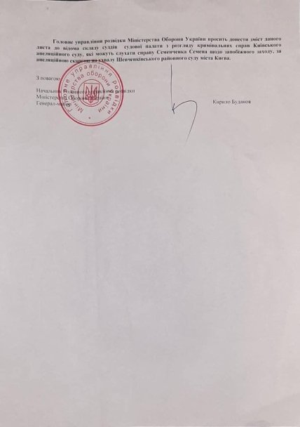 Как пишет издание, за экс-комбата и бывшего нардепа поручился глава Главного управления разведки МО Украины Кирилл Буданов, отправив письмо в суд с просьбой отпустить Семенченко под домашний арест.