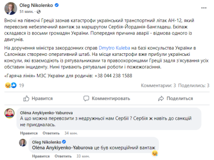 Крушение Ан-12 в Греции: в МИД Украины высказались о причинах и грузе