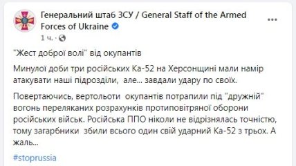 "Российская ПВО никогда не отличалась точностью, поэтому захватчики сбили всего один свой ударный Ка-52 из трех. А жаль", — прокомментировали инцидент в Генштабе, назвав его "жестом доброй воли".