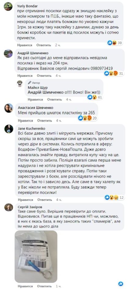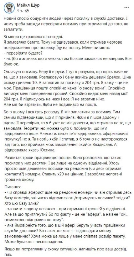 "Оплачиваю посылку. Беру ее в руки. И тут я понимаю, что что-то не то, что я заказывал. Распаковываю и вижу какой-то дешевый брелок. Цена которой гривен 10. А заплатил за посылку я 204 грн. Я говорю – это не мое. Сотрудница почты спокойно говорит "о снова они". Спокойно выписывает мне возврат денег. Спокойно выдает мне назад мои 204 грн. Я подписываюсь на чеке и все. Я ничего не потерял. Но он мог бы потерять. Если бы не взглянул на почту", — написал он.