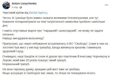 Креативщики удалили предыдущий пост во второй раз (впервые он вернулся, но уже без фотографии министра Александра Ткаченко) и написали новый, в котором изложили свою позицию. "Во-первых, нашей задачей было выбрать безопасный жест для всех территорий Украины. Конечно, мы знаем и уважаем традиционный жест Тризуба из пальцев, который использовал Вячеслав Чорновил. Однако, к сожалению, сейчас его опасно поднимать во временно оккупированных украинских областях. А еще он достаточно сильно ассоциируется с одной из политических партий", — говорится в сообщении Banda.