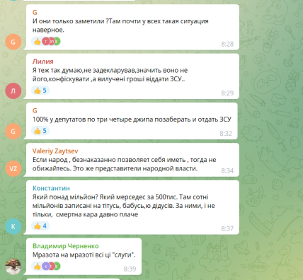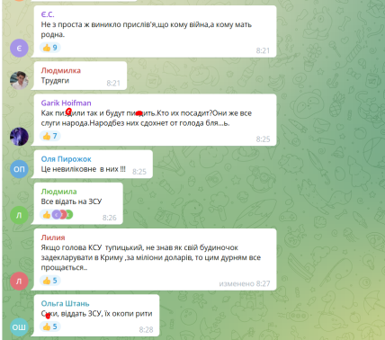 Некоторые подчеркивают, что президент Владимир Зеленский не должен оставаться в стороне и обязательно отреагировать на действия партийцев. В то же время, большинство сошлось во мнении, что "слуг" нужно наказать, отправив рыть окопы, а деньги конфисковать и отдать их на нужды Вооруженных украинских сил.