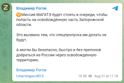Наглое заявление на этот счет опубликовал в своем телеграм-канале коллаборант и гауляйтер Запорожья Владимир Рогов. Он написал что "миссия МАГАТЭ будет стоять в очереди" и "спецпропуска им делать не будут". "А могли бы безопасно, быстро и без препонов добраться из россии через освобожденную территорию", — написал он.