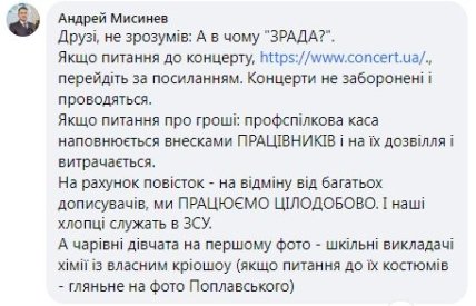 Примечательно, что на этот пост Ткача отреагировал директор газопромышленного управления "Полтавагазвидобування" Андрей Мисинев, который отметил, что в военное время концерты не запрещены, а мероприятие было организовано за счет самих сотрудников.