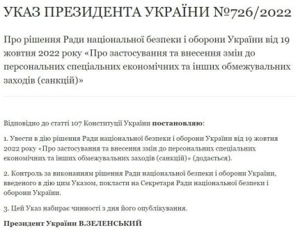 Соответствующие указы со списками в четверг, 20 октября, были опубликованы на официальном сайте президента Владимира Зеленского. Следует отметить, что кроме россиян в перечень подсанкционных попали граждане Германии, ЮАР, Словакии, Франции и других стран, поддерживающих агрессию россии против Украины.