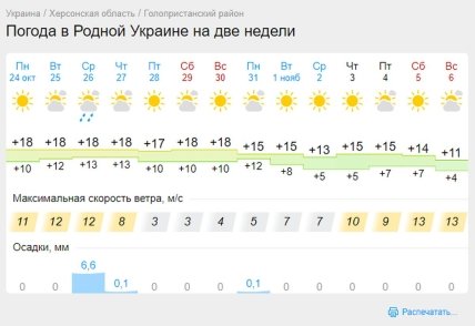 И, наконец, в пятницу, 28 октября, в большинстве областей будет облачно, но с прояснениями; без существенных осадков; ветер северо-западный, 7-12 м/с. Температура ночью 3-8° тепла, днем 10-15° тепла.