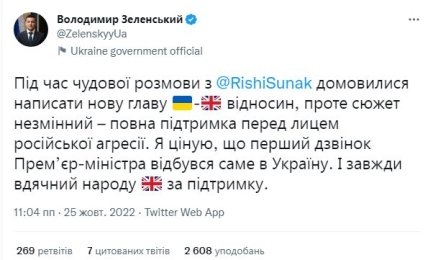 Информацию также подтвердил Зеленский, который к тому же подчеркнул, что этот звонок для Сунака был первым разговором с лидером другой страны на его новом посту.