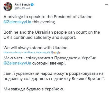 Как сообщил Сунак в своем Твиттер, украинский народ может рассчитывать на солидарность и поддержку со стороны Соединенного Королевства.