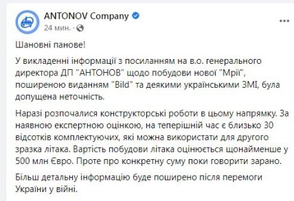 Позже в "Антонове" дали комментарий относительно заявления Гаврилова и сообщили, что в заявлении была допущена неточность. Там отметили, что в настоящее время начаты конструкторские работы в этом направлении, а проект оценили в 500 миллионов евро.