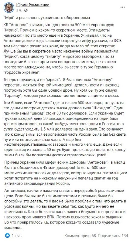 "Учитывая, что на Антонове долгие годы сливали секретную инфу русским, то ФСБ там наверное ржало как кони, когда читало об этих секретах. Лучше бы вы в секретное место накануне войны переместили "Мрию", когда целому "гиганту" мирового авиапрома, что за последние 6 лет не произвел ни одного самолета, не хватило мозгов топ-менеджмента, чтобы вывезти в ту же Германию "гордость Украины", — написал он.
