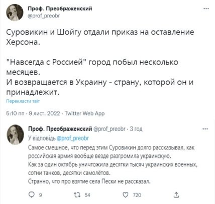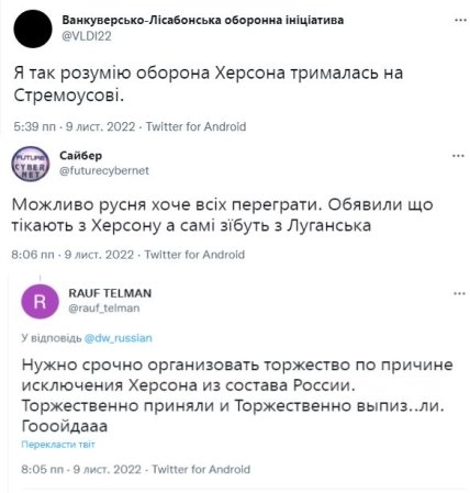 Заявление руководства российской оккупационной армии о том, что они начинают вывод своих войск с правого берега Днепра уже успелр знатно подпортить настроение сторонникам кремлевского режима, а также поднял настроение пользователям сети.