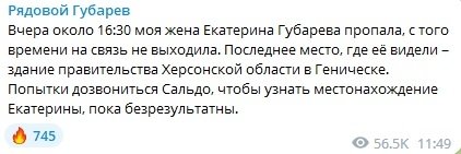 Напомним, что сообщение о пропаже коллаборантки появилось на Telegram-канале ее мужа, одного из бывших руководителей так называемой "Донецкой народной республики" павла губарева, 16 ноября около 12:00. Он сообщил, что его жена пропала и с вечера 15 ноября перестала выходить на связь. Последний раз губареву видели в здании "правительства" оккупированной Херсонщины в Геническе. С вечера ей якобы никто не мог дозвониться.