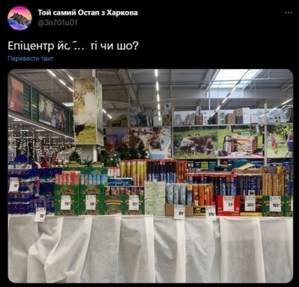 В сети появилась фотография, опубликованная одним из блогеров, сделанная, как утверждается в посте, внутри харьковского "Эпицентра". Как можно заметить, на фото запечатлен прилавок с хлопушками.