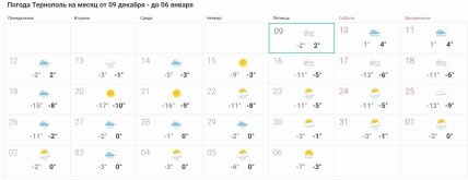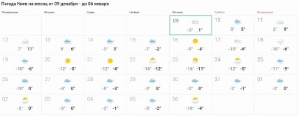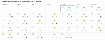 О том, как будет складываться погода в течение месяца, рассказали на сайте "Погодник". Согласно прогнозу специалистов, в Киеве и области температура воздуха в декабря будет совершать "прыжки" в диапазоне от -12°C до +11°C. Температурный максимум +11°C. Осадки ожидаются в такие дни: 09.12.2022, 10.12.2022, 11.12.2022, 12.12.2022, 13.12.2022, 14.12.2022, 15.12.2022, 18.12.2022, 19.12.2022. Ветра прогнозируются до 2.7 м/с.