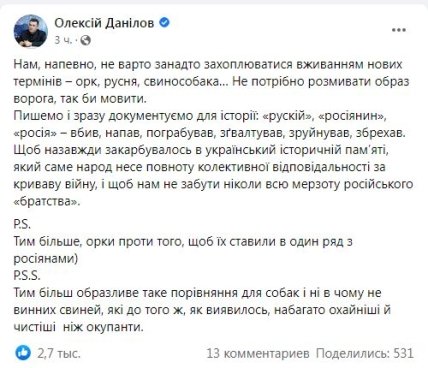Как сообщил в своем Facebook секретарь СНБО Алексей Данилов, использование названий вроде "орк", "русня" и "сви*особака" размывает образ врага.