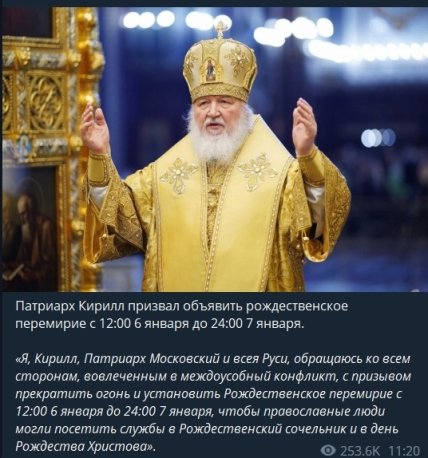 "Я, Кирилл, Патриарх Московский и всея Руси, обращаюсь ко всем сторонам, вовлеченным в междоусобный конфликт, с призывом прекратить огонь и установить Рождественское перемирие с 12:00 6 января до 24:00 7 января, чтобы православные люди могли посетить службы в Рождественский сочельник и в день Рождества Христова", — скаазно в сообщении.