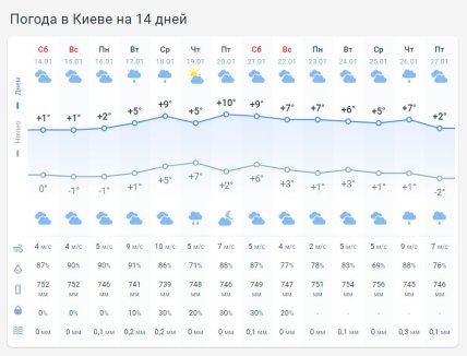 В субботу в течение дня, по ее мнению, температура воздуха будет составлять 0+3 градуса, на западе Украины и в Крыму +3+8 градусов, на северо-востоке (Сумщина, Харьковщина, Луганщина, Полтавщина) от 2 мороза до 1 тепла. Осадки завтра – разве что дождь на западе, в Карпатах с мокрым снегом. В Киеве 14 января без дождя, без снега.
