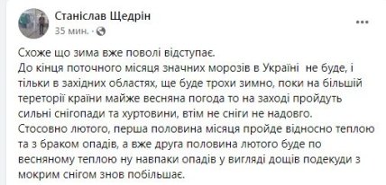Подобный прогноз также дает и синоптик Станислав Щедрин, который говорит, что в начале февраля погода в Украине будет теплой, но сухой, а во второй половине и вовсе будет напоминать весну.