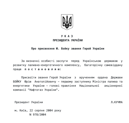 Напомним, что Юрий Бойко получил звание "Героя Украины" в 2004 году от президента Леонида Кучмы. Основанием стали якобы личные заслуги депутата перед Украиной в "развитии топливно-энергетического комплекса".