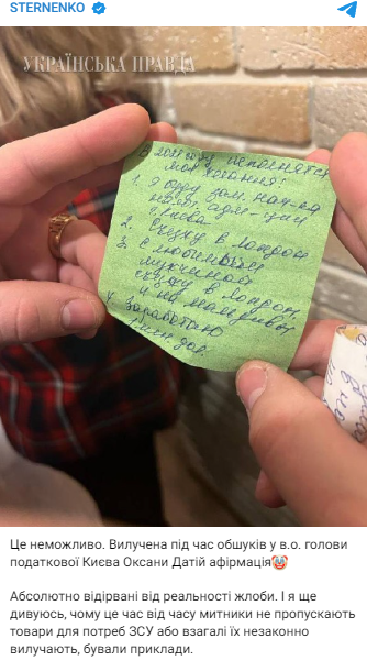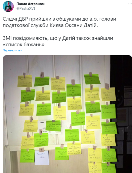 В ходе обысков у и.о. главы налоговой службы Киева Оксаны Датий сотрудники ГБР обнаружили несколько списков желаний к 2018 и 2021 Новому году.